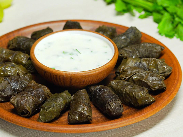Dolma is made from minced meat and grape leaves. As a sauce to dolma is served matsun with garlic.
